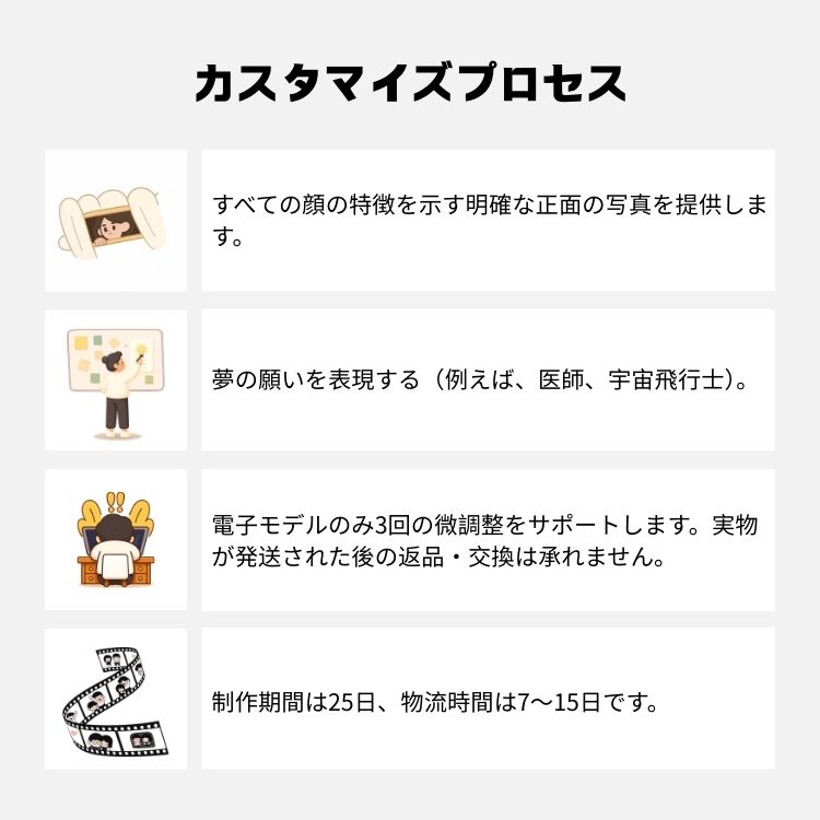 - Rückgabefrist: Da es sich um eine Maßanfertigung handelt, sind Rückgaben und Rückerstattungen nicht möglich.Nur im Fall von beschädigten Waren wird der Verkäufer eine Rücksendung veranlassen.