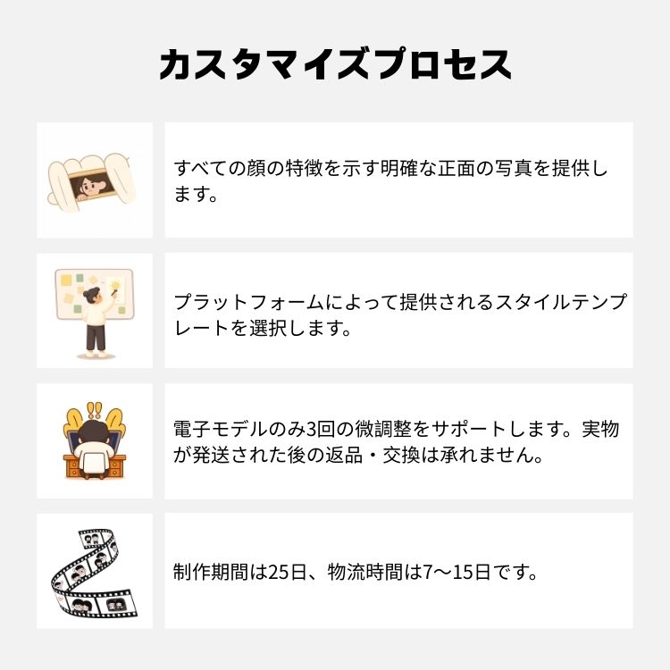 • 返品期限:オーダーメイド商品のため、返品・返金には対応しておりません。商品破損の場合のみ、販売者が再送品手配いたします。
