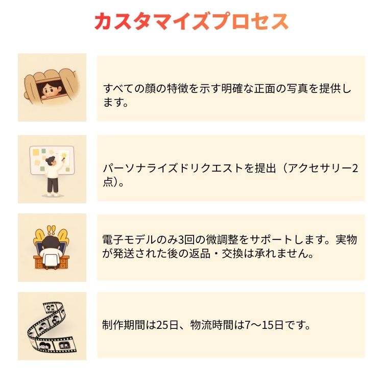 - 返品期限:オーダーメイド商品のため、返品・返金には対応しておりません。商品破損の場合のみ、販売者が再送品手配いたします。