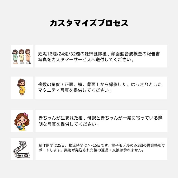 - 返品期限:オーダーメイド商品のため、返品・返金には対応しておりません。商品破損の場合のみ、販売者が再送品手配いたします。